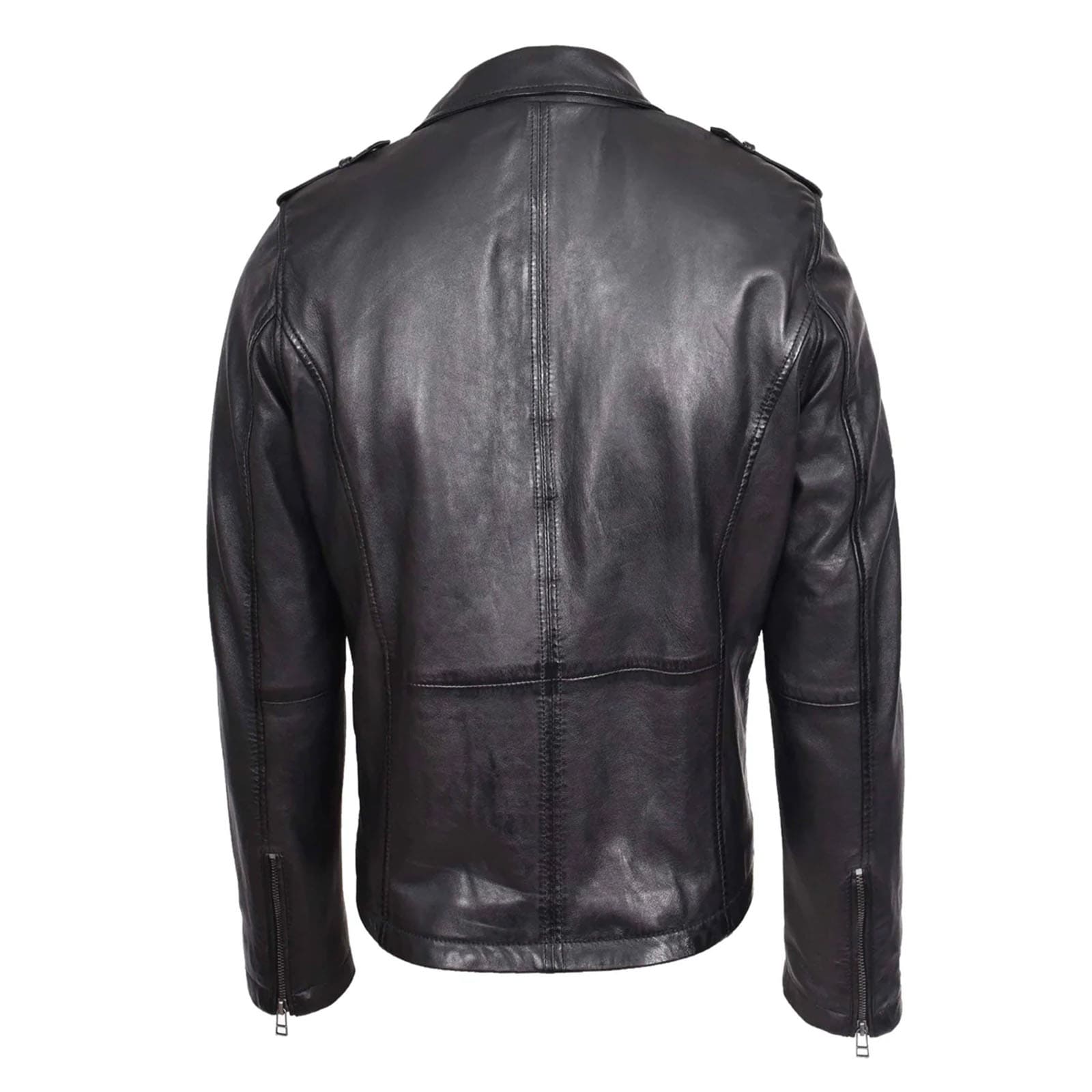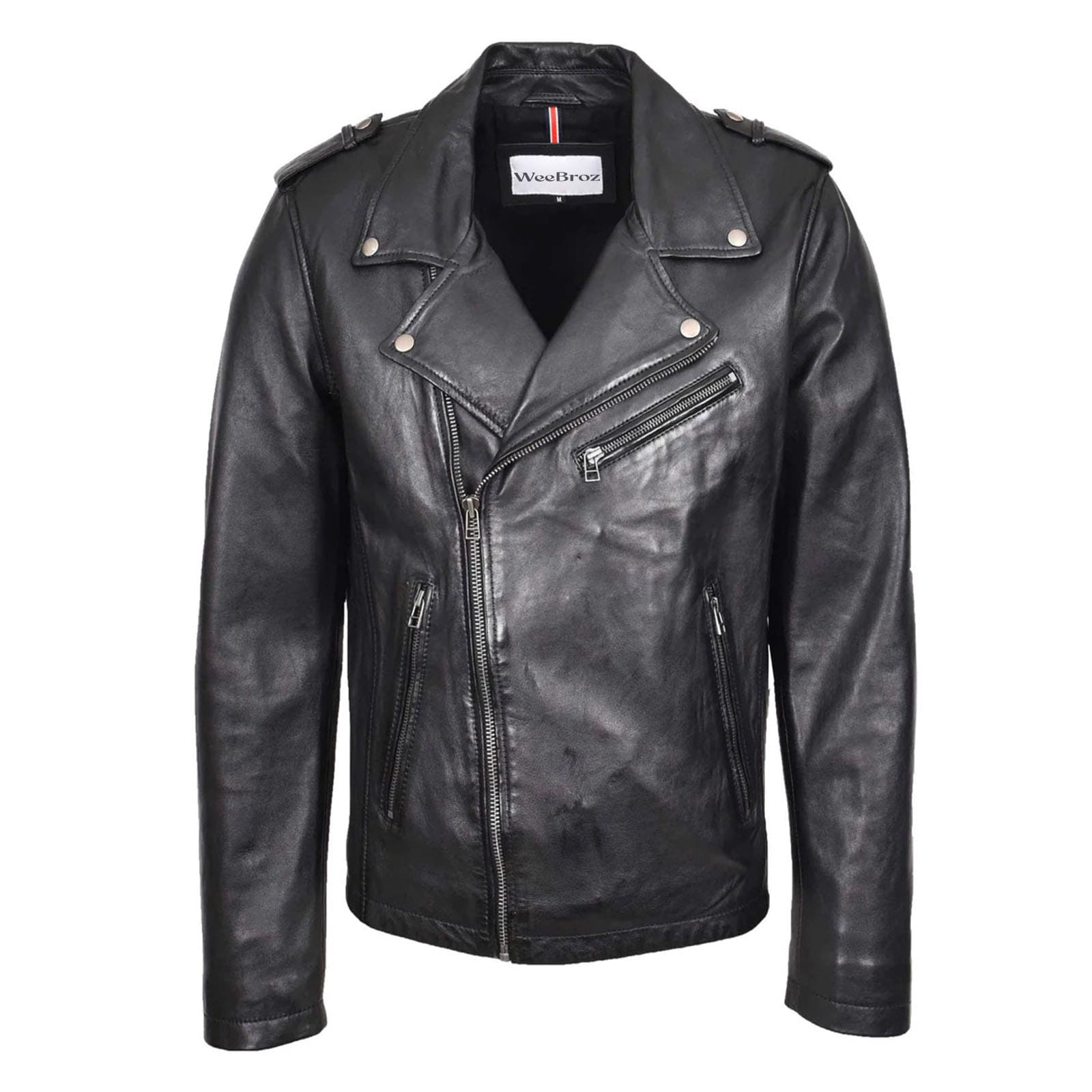 WeeBroz Men’s Black Leather Biker Jacket Cross Zip Brando Biker Style
