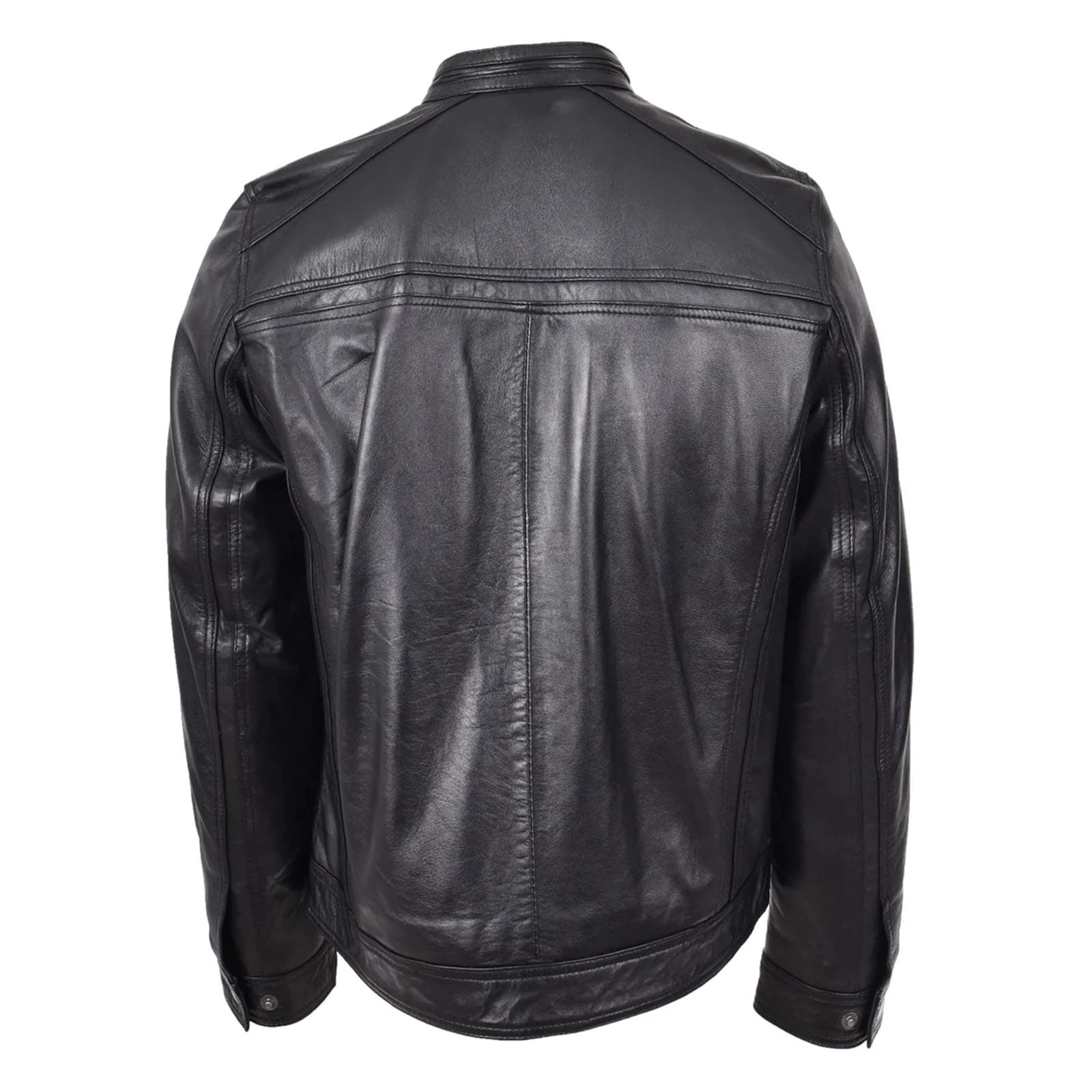 WeeBroz Men’s Black Leather Biker Jacket Standing Collar Racer Style