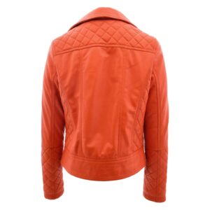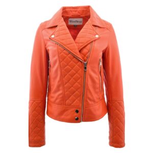WeeBroz Women’s Orange Leather Biker Jacket Quilt Detail Style