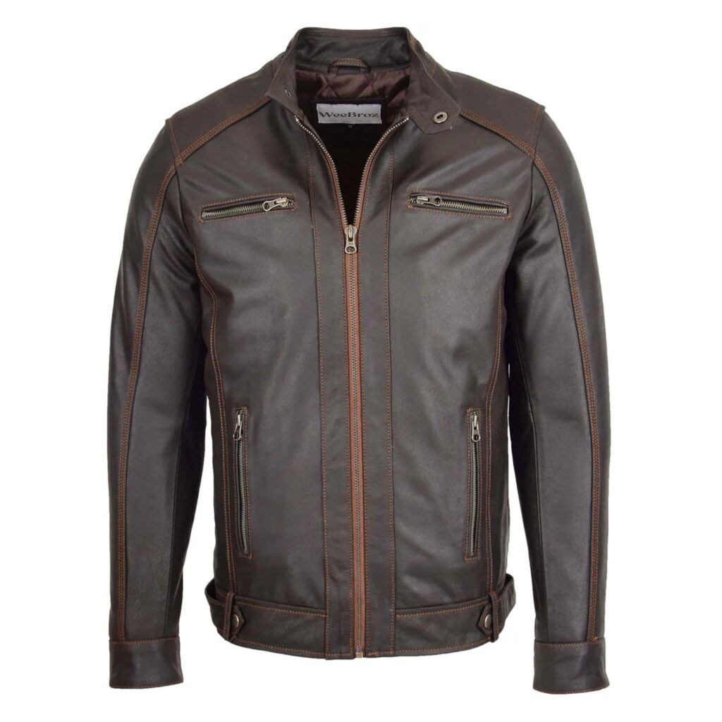 WeeBroz Men’s Antique Brown Leather Biker Jacket Cafe Racer Biker Style