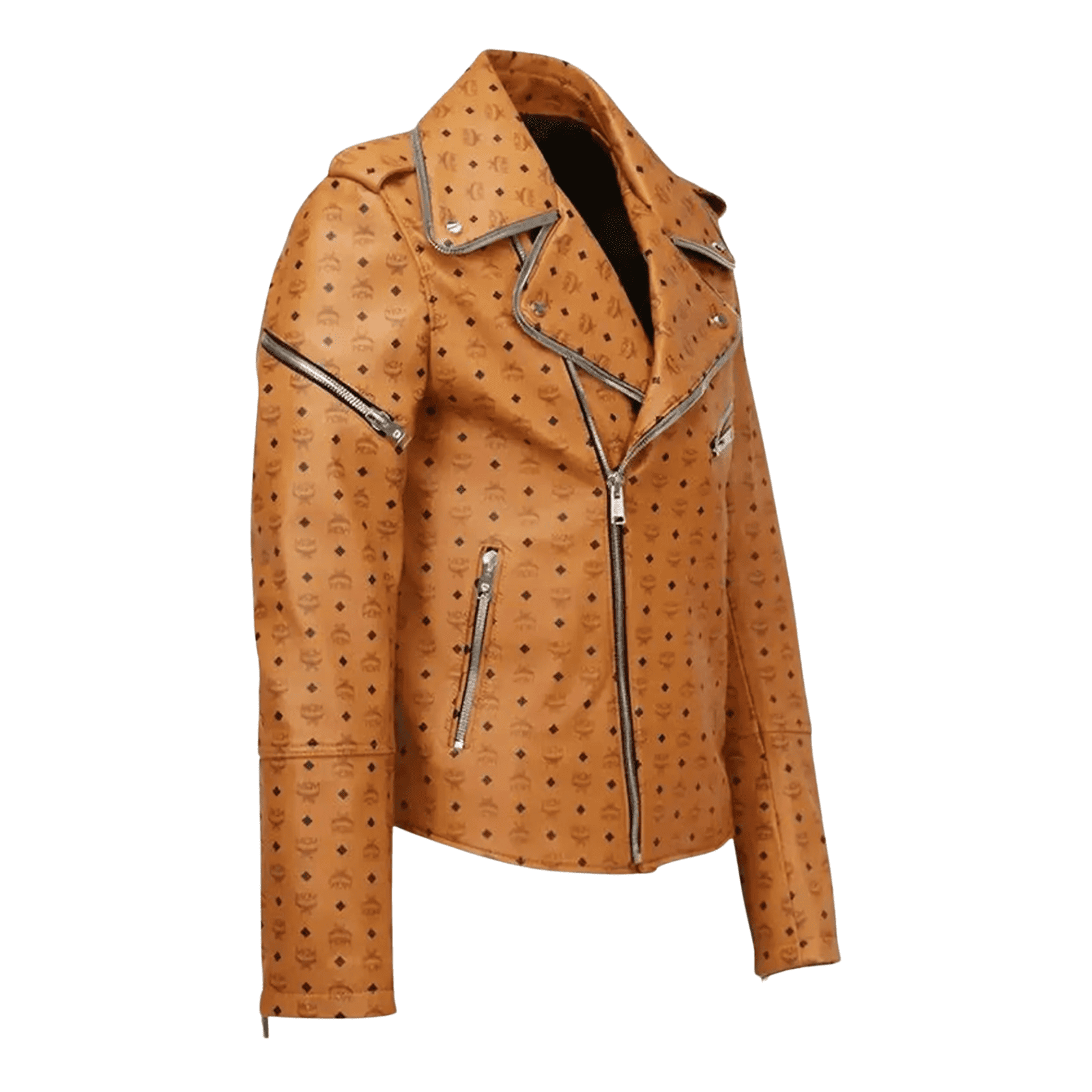 Featuring an iconic MCM-style monogram pattern, this leather biker jacket adds a high-end fashion edge while maintaining a timeless bomber silhouette. Reinforced stitching, a smooth inner lining, and expert craftsmanship ensure long-lasting quality and comfort. Whether worn for riding, streetwear styling, or casual outings, this handmade leather jacket is a statement piece for those who value modern biker fashion.