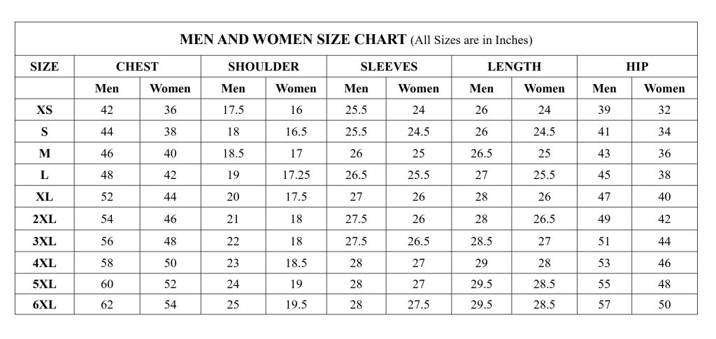 - XS, S, M, L, XL, 2XL, 3XL, 4XL, 5XL, 6XL, and custom sizes can be available.