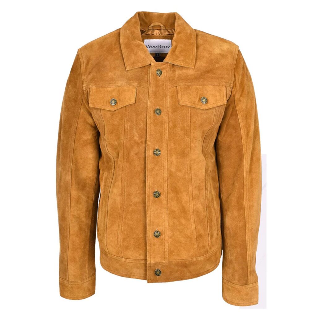 WeeBroz Men’s Tan Leather Biker Jacket Suede Trucker Style
