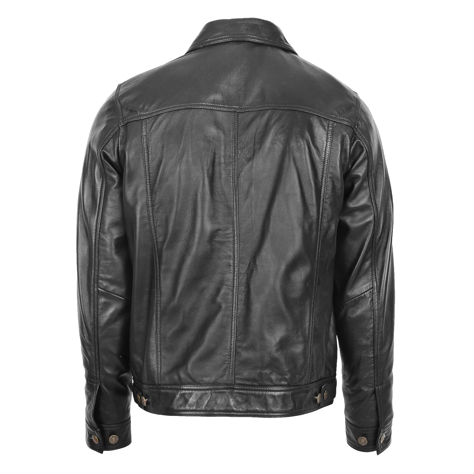 Shop the timeless men’s leather biker jacket in black crafted from luxuriously soft sheep nappa leather, designed to offer both style and comfort. This classic leather motorcycle jacket features a sleek button fastening, four spacious front pockets for practicality, and refined button details on the cuffs.