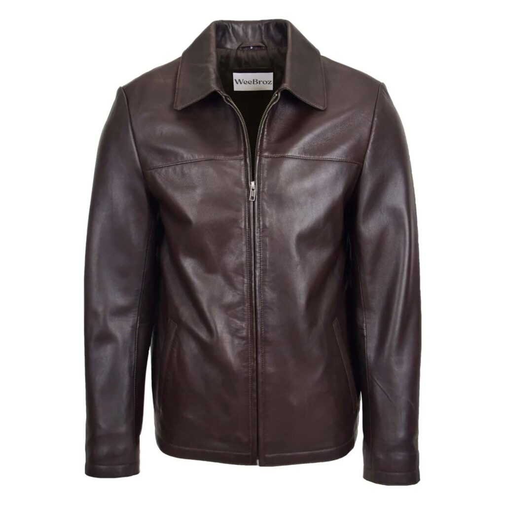 WeeBroz Men’s Brown Leather Biker Jacket Zip Box Harrington Style