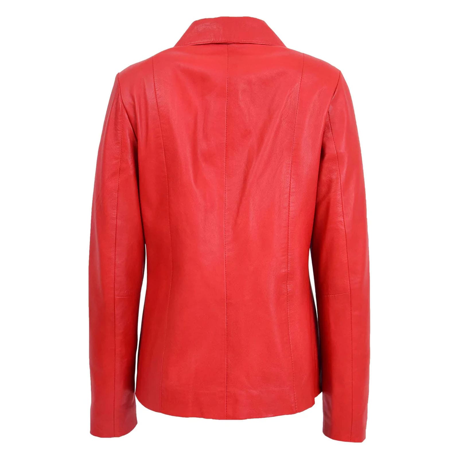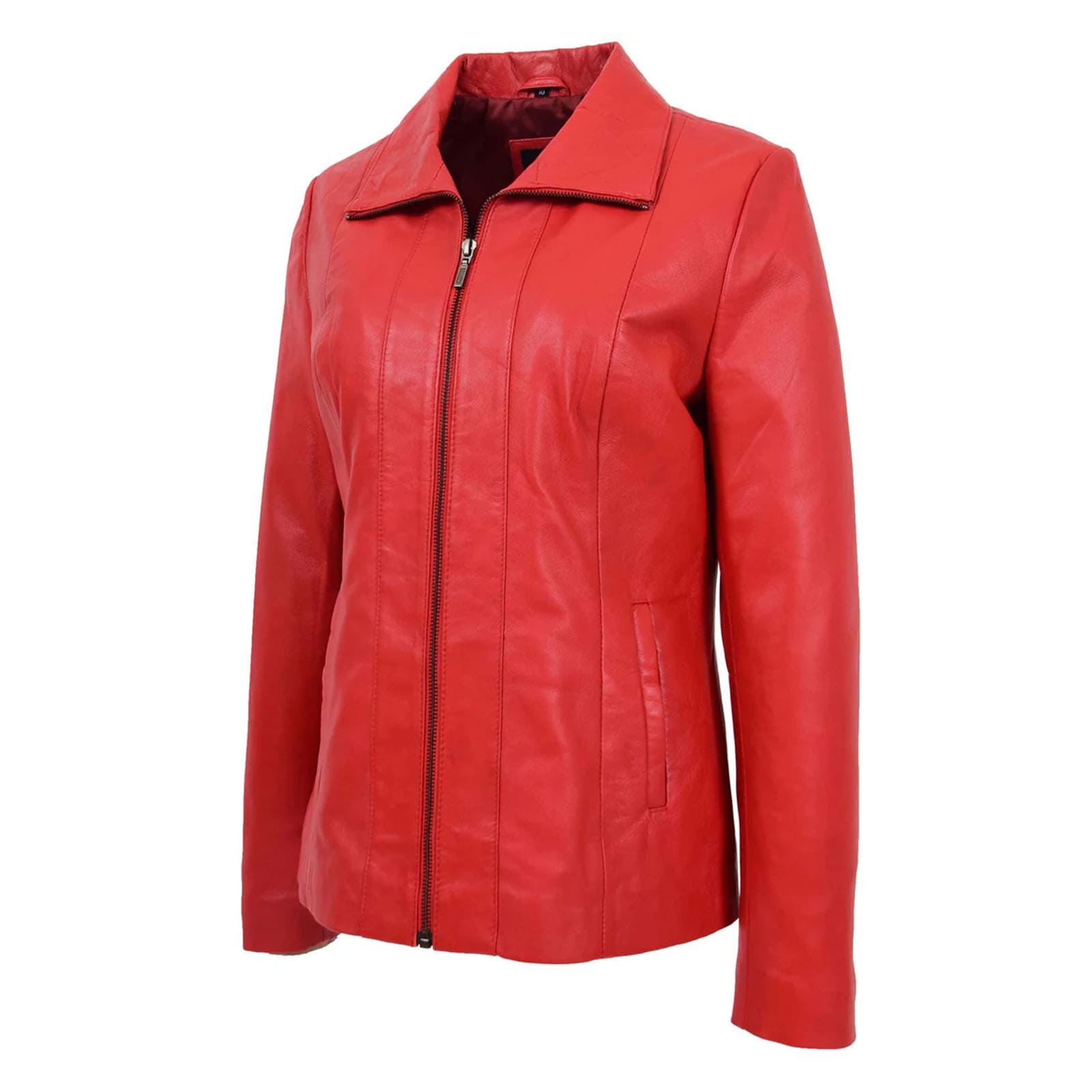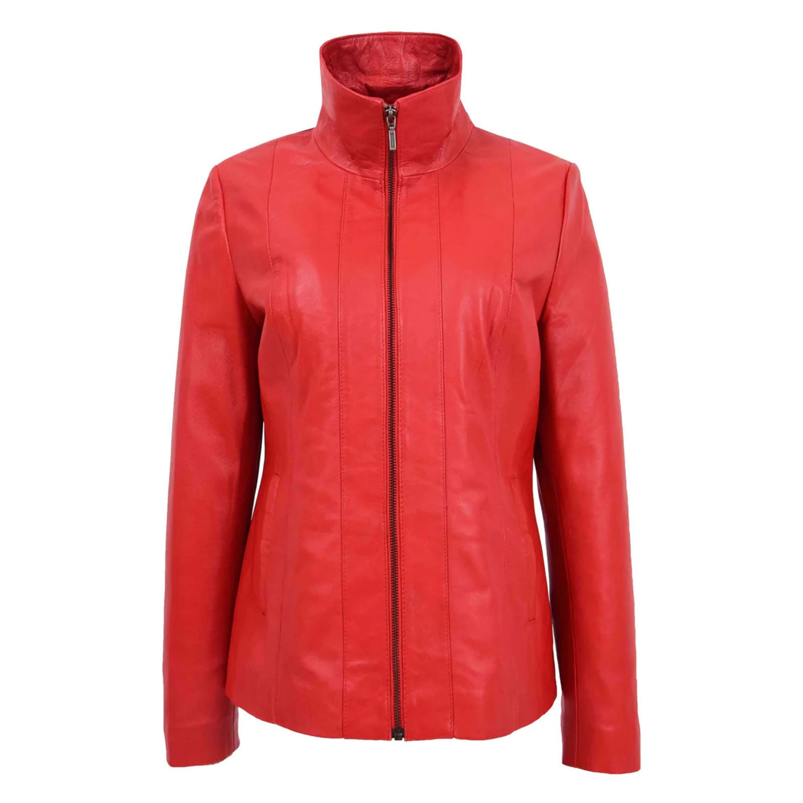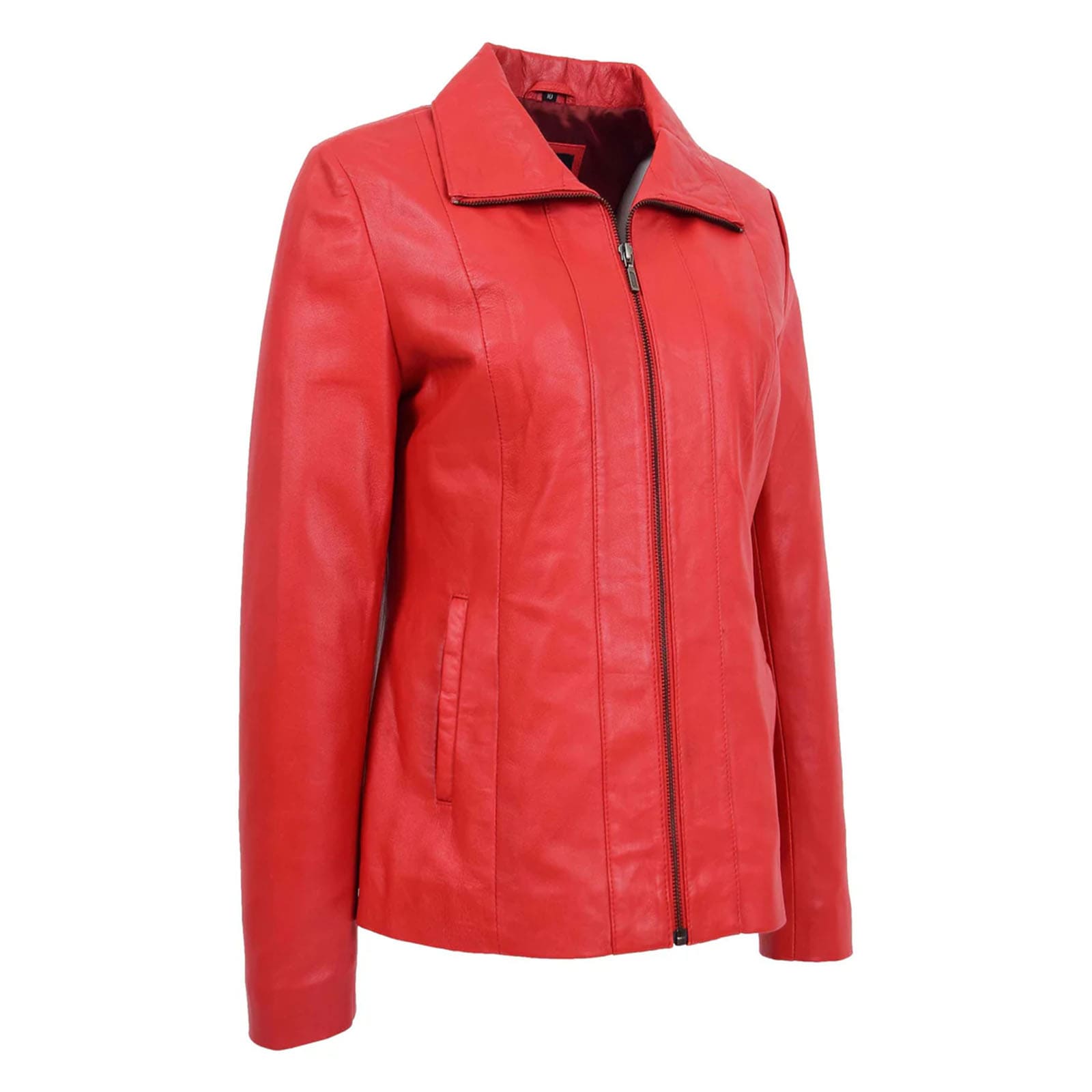 Shop the Semi-Fitted Women’s Real Leather Biker Jacket in Red – a timeless classic and top favorite among stylish women worldwide. Expertly crafted from soft and lightweight lamb leather, this elegant biker jacket combines durability with comfort. It features a premium YKK front zip fastening that extends to the collar, two practical front pockets, and a fully lined polyester interior.