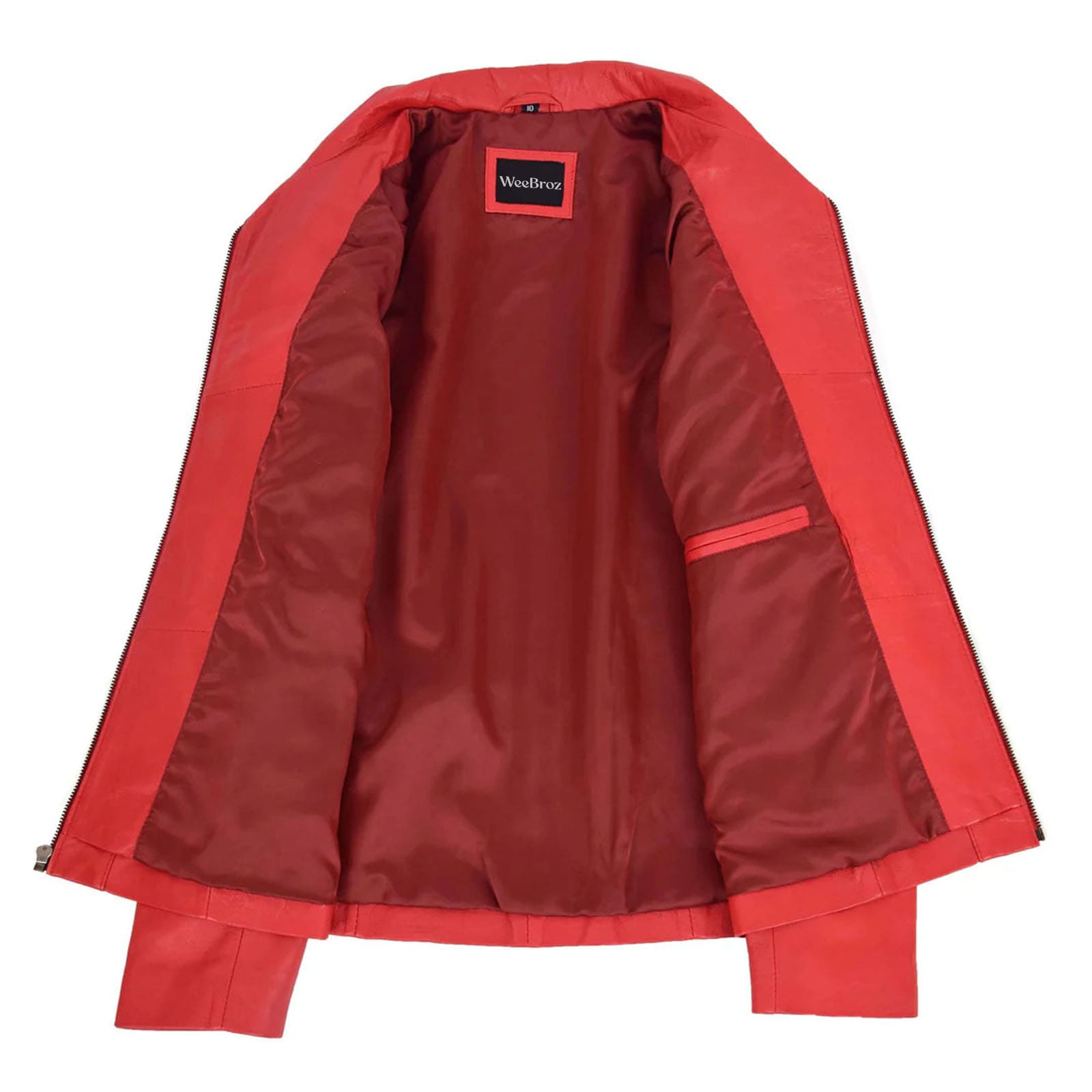 WeeBroz Women’s Red Leather Biker Jacket Classic Zipper Style